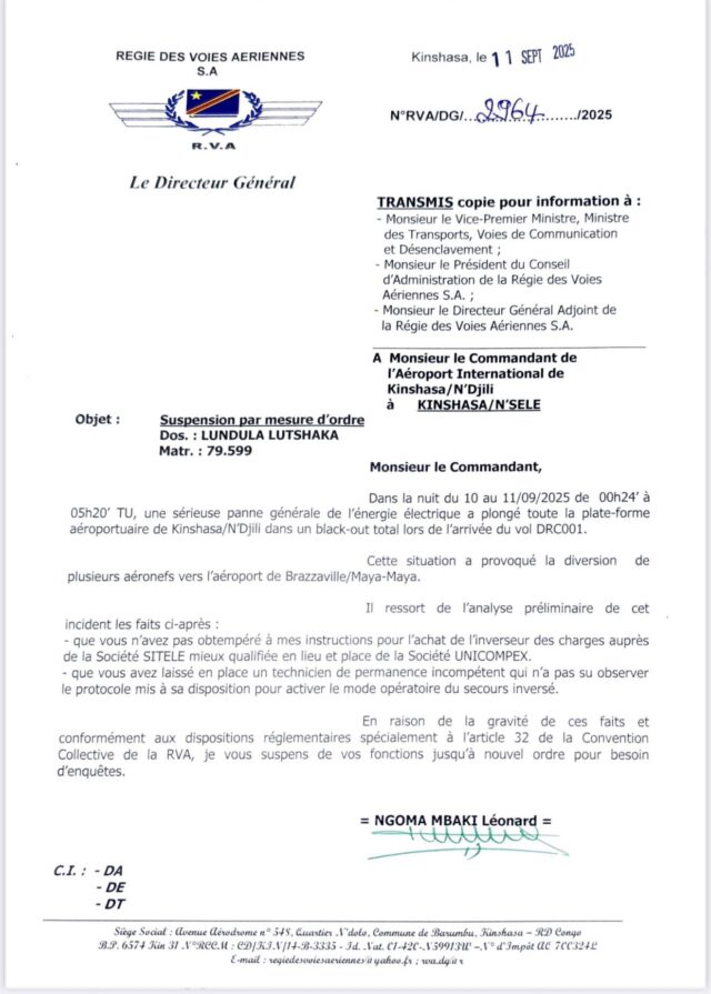 Accueil A la une Scandale à l’aéroport international de N’djili : le commandant suspendu (Officiel)
