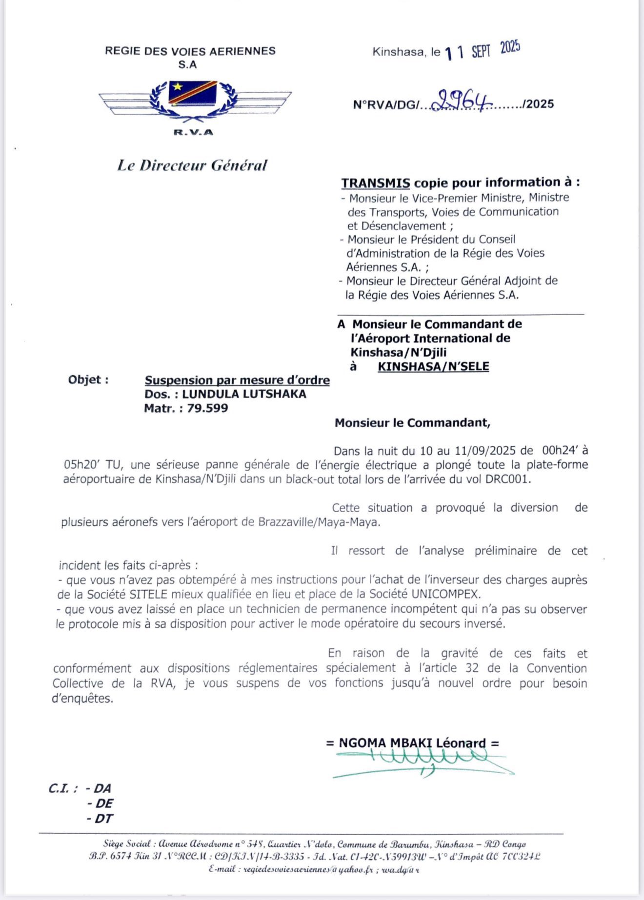 (Communiqué du DG de la Régie des Voies Aériennes “RVA”)